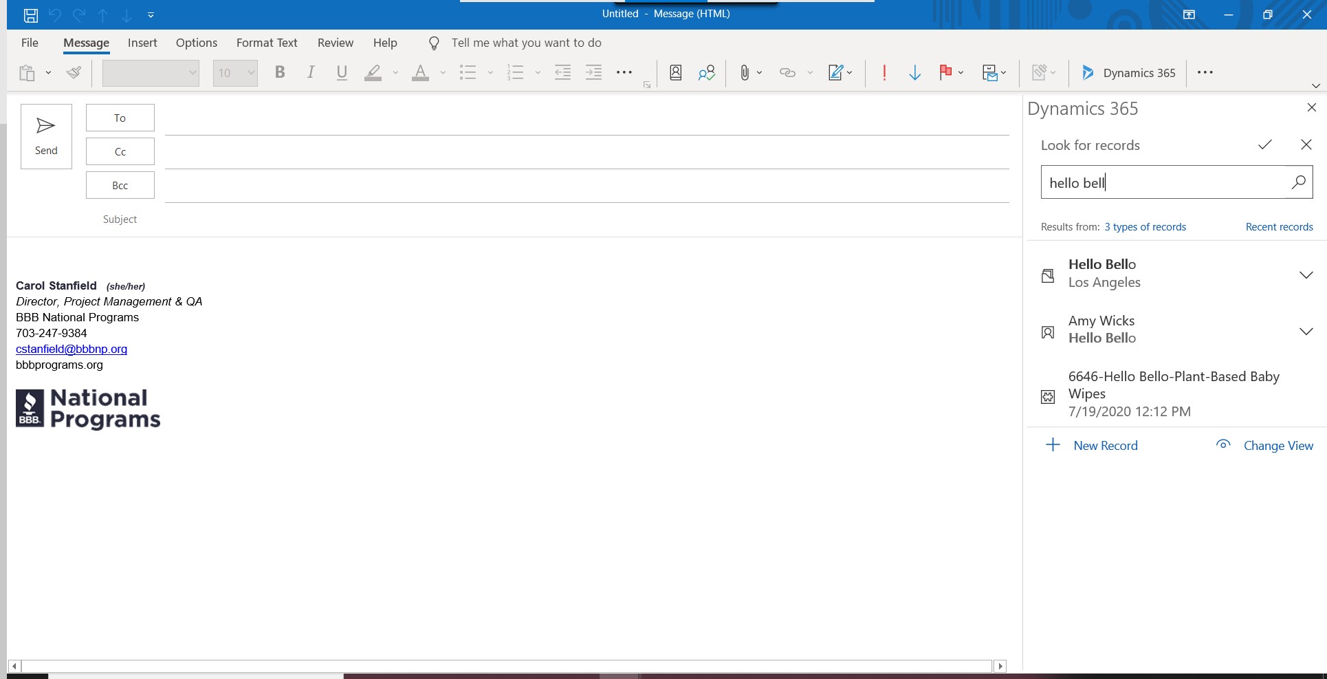 When sending an email from Outlook, enable the Dynamics 365 panel.